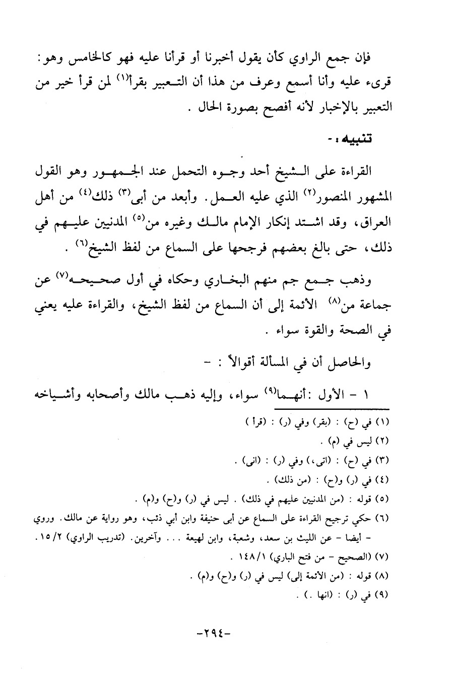 الْقِرَاءَة على الشَّيْخ أحد وُجُوه التَّحَمُّل عِنْد الْجُمْهُور وَهُوَ القَوْل الْمَشْهُور الْمَنْصُور الَّذِي عَلَيْهِ الْعَمَل. وَأبْعد من أَبى ذَلِك من أهل الْعرَاق، وَقد اشْتَدَّ إِنْكَار الإِمَام مَالك وَغَيره من الْمَدَنِيين عَلَيْهِم فِي ذَلِك، حَتَّى بَالغ بَعضهم فرجحها على السماع من لفظ الشَّيْخ.