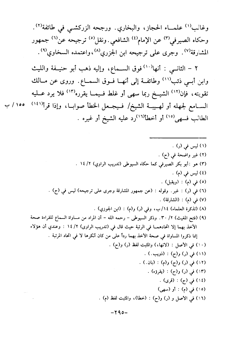2 - الثَّانِي: أَنَّهَا فَوق السماع، وَإِلَيْهِ ذهب أَبُو حنيفَة وَاللَّيْث وَابْن أبي ذِئْب وَطَائِفَة إِلَى أَنَّهَا فَوق السماع. وروى عَن مَالك تقويته، فَإِن الشَّيْخ رُبمَا سهى أَو غلط فِيمَا يقرره فَلَا يرد عَلَيْهِ السَّامع لجهله أَو لهيبة الشَّيْخ / فَيجْعَل الْخَطَأ صَوَابا، وَإِذا قَرَأَ الطَّالِب فسهى أَو أَخطَأ رد عَلَيْهِ الشَّيْخ أَو غَيره.