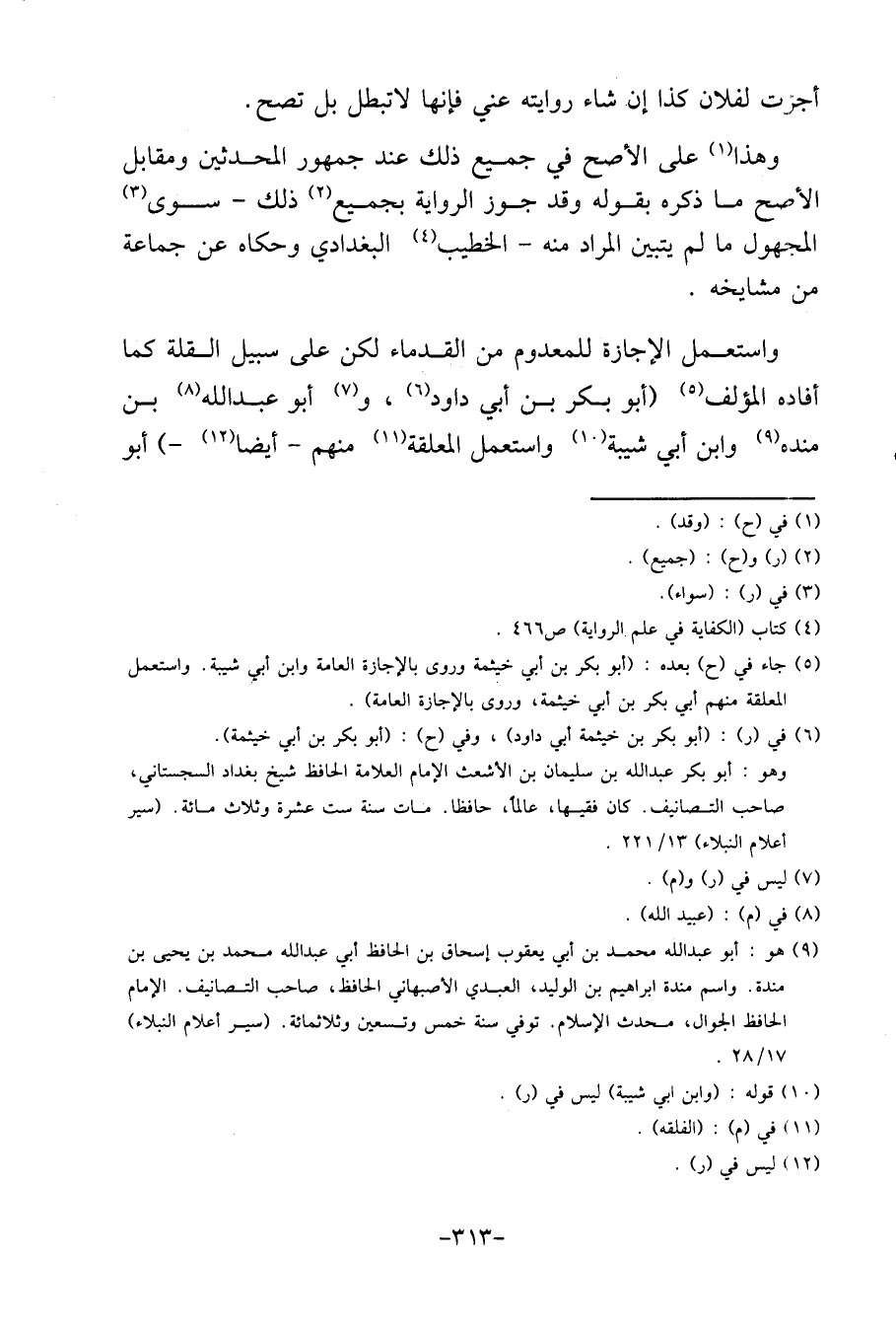 وَاسْتعْمل الْإِجَازَة للمعدوم من القدماء لَكِن على سَبِيل الْقلَّة كَمَا أَفَادَهُ الْمُؤلف (أَبُو بكر بن أبي دَاوُد، وَأَبُو عبد الله بن مَنْدَه وَابْن أبي شيبَة وَاسْتعْمل الْمُعَلقَة مِنْهُم - أَيْضا -) أَبُو