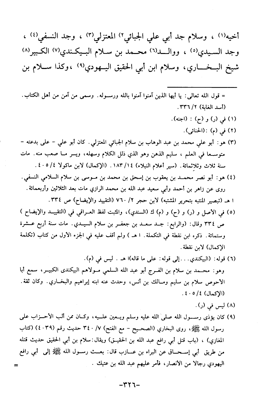 أَخِيه، وَسَلام جد أبي عَليّ الجبائي المعتزلي، وجد النَّسَفِيّ، وجد السيدي، ووالد مُحَمَّد بن سَلام البيكندي الْكَبِير شيخ البُخَارِيّ، وَسَلام ابْن أبي الْحقيق الْيَهُودِيّ، وَكَذَا سَلام بن