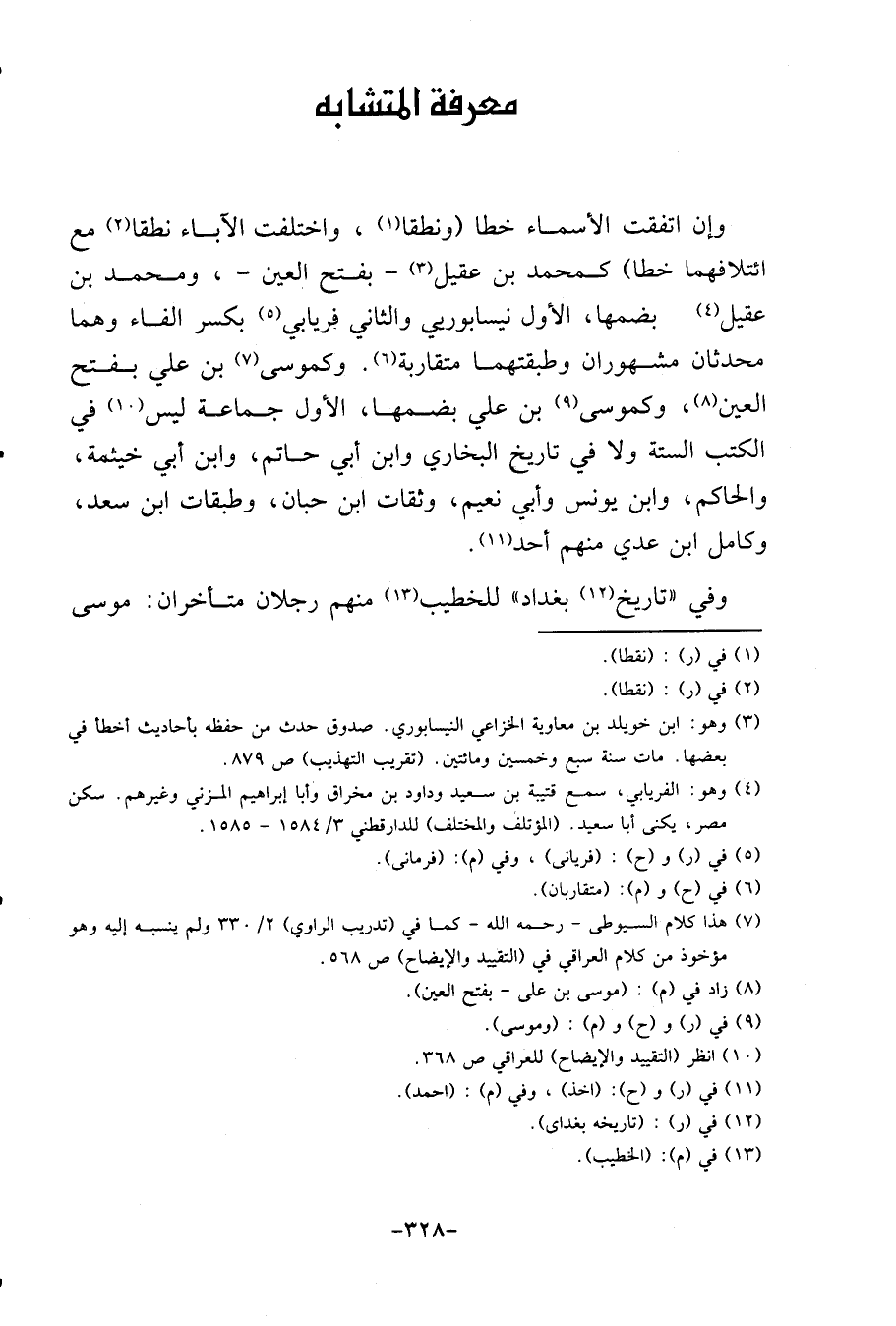 وَإِن اتّفقت الْأَسْمَاء خطا (ونطقا، وَاخْتلفت الْآبَاء نطقا مَعَ ائتلافهما خطا) كمحمد بن عقيل - بِفَتْح الْعين -، وَمُحَمّد بن عقيل بضَمهَا، الأول نيسابوريي وَالثَّانِي فريابي بِكَسْر الْفَاء وهما محدثان مشهوران وطبقتهما مُتَقَارِبَة. وكموسى بن عَليّ بِفَتْح الْعين، وكموسى بن عَليّ بضَمهَا، الأول جمَاعَة لَيْسَ فِي الْكتب السِّتَّة وَلَا فِي تَارِيخ البُخَارِيّ وَابْن أبي حَاتِم، وَابْن أبي خَيْثَمَة، وَالْحَاكِم، وَابْن يُونُس وَأبي نعيم، وثقات ابْن حبَان، وطبقات ابْن سعد، وكامل ابْن عدي مِنْهُم أحد.