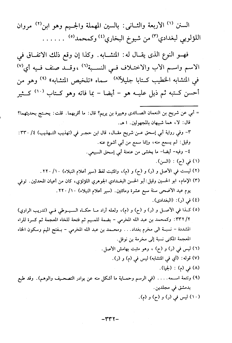 فَهُوَ النَّوْع الَّذِي يُقَال لَهُ: الْمُتَشَابه. وَكَذَا إِن وَقع ذَلِك الِاتِّفَاق فِي الِاسْم وَاسم الاب وَالِاخْتِلَاف فِي النِّسْبَة، وَقد صنف فِيهِ أَي فِي الْمُتَشَابه الْخَطِيب كتابا جَلِيلًا سَمَّاهُ " تَلْخِيص الْمُتَشَابه " وَهُوَ من أحسن كتبه ثمَّ ذيل عَلَيْهِ هُوَ - أَيْضا - بِمَا فَاتَهُ وَهُوَ كتاب كثير