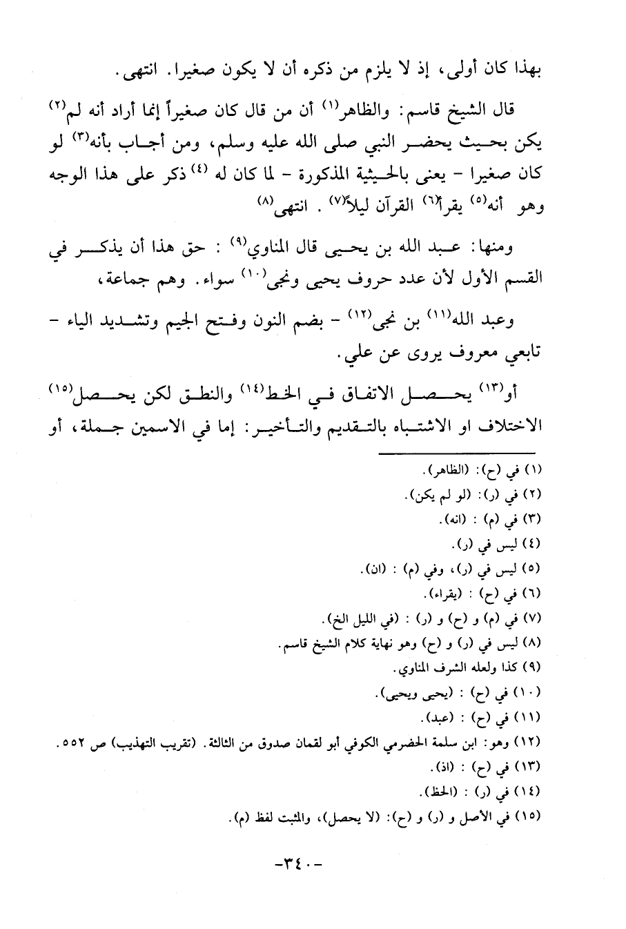 قَالَ الشَّيْخ قَاسم: وَالظَّاهِر أَن من قَالَ كَانَ صَغِيرا إِنَّمَا أَرَادَ أَنه لم يكن بِحَيْثُ يحضر النَّبِي، وَمن أجَاب بِأَنَّهُ لَو كَانَ صَغِيرا - يعْنى بالحيثية الْمَذْكُورَة - لما كَانَ لَهُ ذكر على هَذَا الْوَجْه وَهُوَ أَنه يقْرَأ الْقُرْآن لَيْلًا. انْتهى.