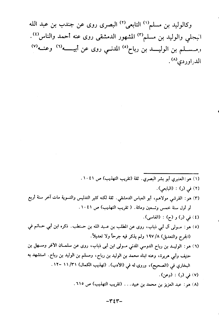 وكالوليد بن مُسلم التَّابِعِيّ الْبَصْرِيّ روى عَن جُنْدُب بن عبد الله البَجلِيّ والوليد بن مُسلم الْمَشْهُور الدِّمَشْقِي روى عَنهُ أَحْمد وَالنَّاس. وَمُسلم بن الْوَلِيد بن رَبَاح الْمدنِي روى عَن أَبِيه وَعنهُ الدَّرَاورْدِي.