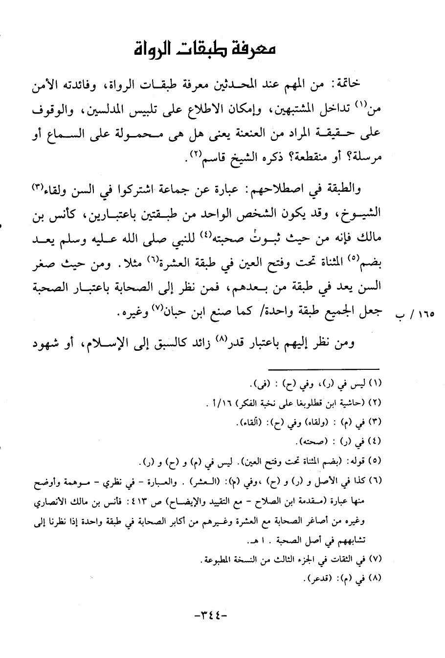 والطبقة فِي اصطلاحهم: عبارَة عَن جمَاعَة اشْتَركُوا فِي السن ولقاء الشُّيُوخ، وَقد يكون الشَّخْص الْوَاحِد من طبقتين باعتبارين، كأنس بن مَالك فَإِنَّهُ من حَيْثُ ثُبُوت صحبته للنَّبِي يعد بِضَم الْمُثَنَّاة تَحت وَفتح الْعين فِي طبقه الْعشْرَة مثلا. وَمن حَيْثُ صغر السن يعد فِي طبقَة من بعدهمْ، فَمن نظر إِلَى الصَّحَابَة بِاعْتِبَار الصُّحْبَة جعل الْجَمِيع طبقَة وَاحِدَة / كَمَا صنع ابْن حبَان وَغَيره.