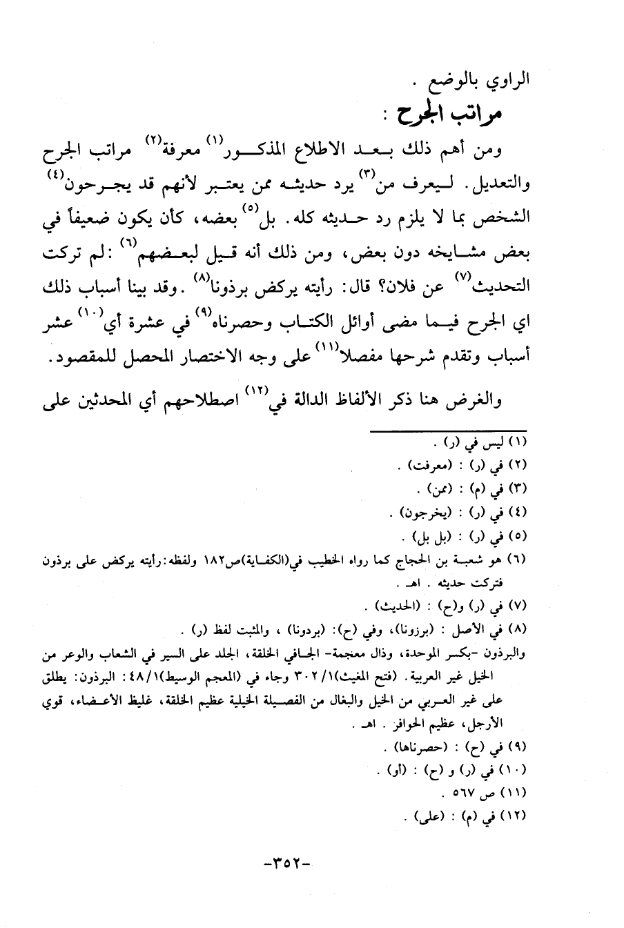 مَرَاتِب الْجرْح: وَمن أهم ذَلِك بعد الِاطِّلَاع الْمَذْكُور معرفَة مَرَاتِب الْجرْح وَالتَّعْدِيل. ليعرف من يرد حَدِيثه مِمَّن يعْتَبر لأَنهم قد يجرحون الشَّخْص بِمَا لَا يلْزم رد حَدِيثه كُله. بل بعضه، كَأَن يكون ضَعِيفا فِي بعض مشايخه دون بعض، وَمن ذَلِك أَنه قيل لبَعْضهِم: لم تركت التحديث عَن فلَان؟ قَالَ: رَأَيْته يرْكض برذونا. وَقد بَينا أَسبَاب ذَلِك أَي الْجرْح فِيمَا مضى أَوَائِل الْكتاب وحصرناه فِي عشرَة أَي عشر أَسبَاب وَتقدم شرحها مفصلا على وَجه الِاخْتِصَار المحصل للمقصود.