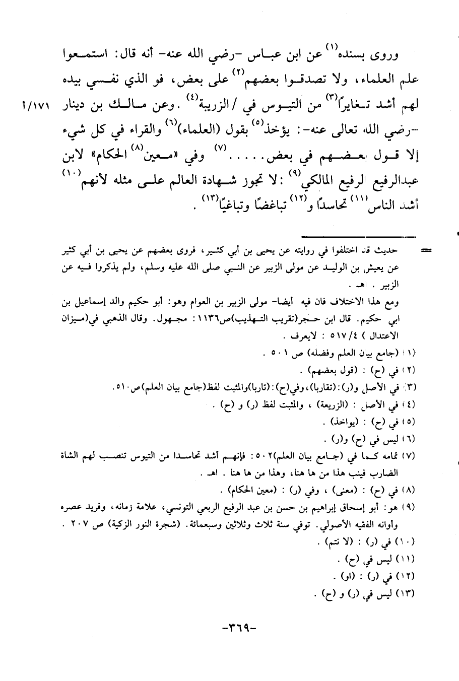 وروى بِسَنَدِهِ عَن ابْن عَبَّاس - رَضِي الله عَنهُ - أَنه قَالَ: اسْتَمعُوا علم الْعلمَاء، وَلَا تصدقوا بَعضهم على بعض، فو الَّذِي نَفسِي بِيَدِهِ لَهُم أَشد تغايرا من التيوس فِي / الزريبة. وَعَن مَالك بن دِينَار - رَضِي الله تَعَالَى عَنهُ -: يُؤْخَذ بقول (الْعلمَاء) والقراء فِي كل شَيْء إِلَّا قَول بَعضهم فِي بعض. . وَفِي " معِين الْحُكَّام " لِابْنِ عبد الرفيع الرفيع الْمَالِكِي: لَا تجوز شَهَادَة الْعَالم على مثله لأَنهم أَشد النَّاس تحاسدا وتباغضا وتباغيا.