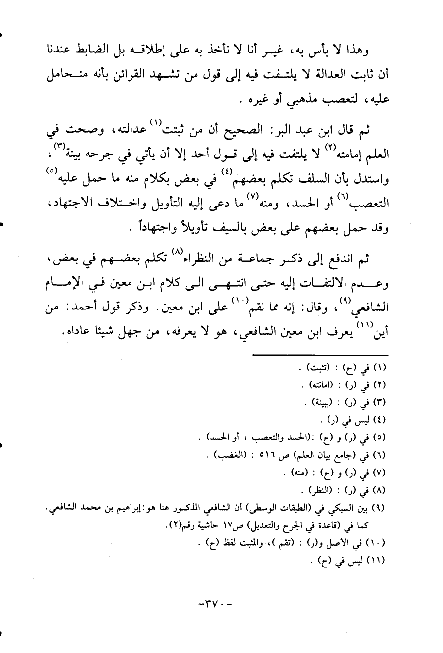 ثمَّ قَالَ ابْن عبد الْبر: الصَّحِيح أَن من ثبتَتْ عَدَالَته، وَصحت فِي الْعلم إِمَامَته لَا يلْتَفت فِيهِ إِلَى قَول أحد إِلَّا أَن يَأْتِي فِي جرحه بَينه، وَاسْتدلَّ بِأَن السّلف تكلم بَعضهم فِي بعض بِكَلَام مِنْهُ مَا حمل عَلَيْهِ التعصب أَو الْحَسَد، وَمِنْه مَا دعِي إِلَيْهِ التَّأْوِيل وَاخْتِلَاف الِاجْتِهَاد، وَقد حمل بَعضهم على بعض بِالسَّيْفِ تَأْوِيلا واجتهادا.