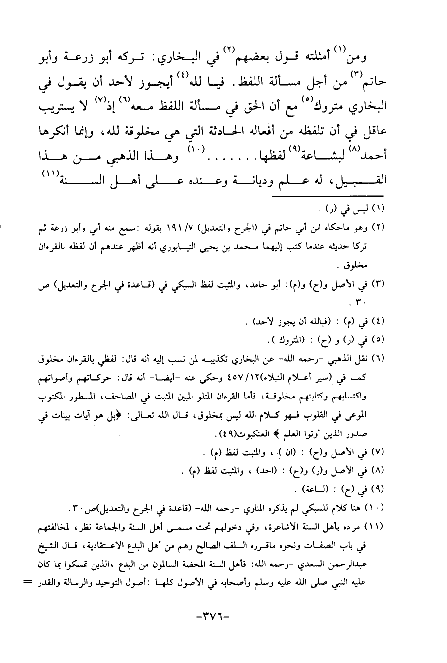 وَمن أَمْثِلَة قَول بَعضهم فِي البُخَارِيّ: تَركه أَبُو زرْعَة وَأَبُو حَاتِم من أجل مَسْأَلَة اللَّفْظ. فيا لله ايجوز لأحد أَن يَقُول فِي البُخَارِيّ مَتْرُوك مَعَ أَن الْحق فِي مَسْأَلَة اللَّفْظ مَعَه إِذْ لَا يستريب عَاقل فِي أَن تلفظه من أَفعاله الْحَادِثَة الَّتِي هِيَ مخلوقة لله، وَإِنَّمَا أنكرها أَحْمد لبشاعة لَفظهَا ... وَهَذَا الذَّهَبِيّ من هَذَا الْقَبِيل، لَهُ علم وديانة وَعِنْده على أهل السّنة