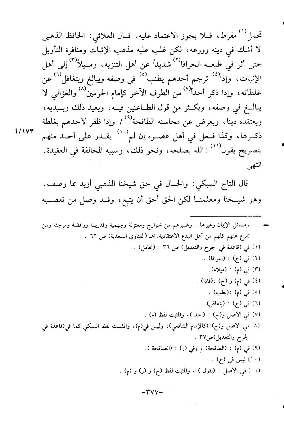 تحمل مفرط، فَلَا يجوز الِاعْتِمَاد عَلَيْهِ. قَالَ العلائي: الْحَافِظ الذَّهَبِيّ لَا اشك فِي دينه وورعه، لَكِن غلب عَلَيْهِ مَذْهَب الْإِثْبَات ومنافرة التَّأْوِيل حَتَّى أثر فِي طبعة انحرافا شَدِيدا عَن أهل التَّنْزِيه، وميلا إِلَى أهل الْإِثْبَات، وَإِذا ترْجم أحدهم يطنب فِي وَصفه ويبالغ ويتغافل عَن غلطاته، وَإِذا ذكر أحدا من الطّرف الآخر كإمام الْحَرَمَيْنِ وَالْغَزالِيّ لَا يُبَالغ فِي وَصفه، وَيكثر من قَول الطاعنين فِيهِ، وَيُعِيد ذَلِك ويبديه، ويعتقده دينا، ويعرض عَن محاسنة الطافحة / وَإِذا ظفر لأَحَدهم بغلطة ذكرهَا، وَكَذَا فعل فِي أهل عصره إِن لم يقدر على أحد مِنْهُم بتصريح يَقُول: الله يصلحه، وَنَحْو ذَلِك، وَسَببه الْمُخَالفَة فِي العقيدة. انْتهى.