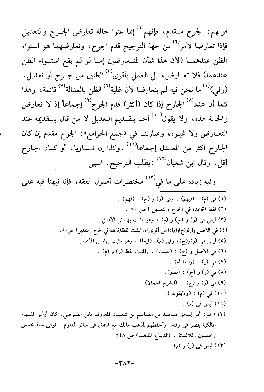 قَوْلهم: الْجرْح مقدم، فَإِنَّهُم إِنَّمَا عنوا حَالَة تعَارض الْجرْح وَالتَّعْدِيل فَإِذا تَعَارضا لأمر من جِهَة التَّرْجِيح قدم الْجرْح، وتعارضهما هُوَ اسْتِوَاء الظَّن عِنْدهمَا (لِأَن هَذَا شَأْن المتعارضين إِمَّا لَو لم يَقع اسْتِوَاء الظَّن عِنْدهمَا) فَلَا تعَارض، بل الْعَمَل بأقوى الظنين من جرح أَو تَعْدِيل، (وَفِي) مَا نَحن فِيهِ لم يتعارضا لِأَن غَلَبَة الظَّن بِالْعَدَالَةِ قَائِمَة، وَهَذَا كَمَا أَن عدد الْجَارِح إِذا كَانَ (أَكثر) قدم الْجرْح إِجْمَاعًا إِذْ لَا تعَارض وَالْحَالة هَذِه، وَلَا يَقُول أحد بِتَقْدِيم التَّعْدِيل لَا من قَالَ بتقديمة عِنْد التَّعَارُض وَلَا غَيره، وعبارتنا فِي " جمع الْجَوَامِع ": الْجرْح مقدم إِن كَانَ الْجَارِح أَكثر من الْمعدل إِجْمَاعًا، وَكَذَا إِن تَسَاويا، أَو كَانَ الْجَارِح أقل. وَقَالَ ابْن شعْبَان: يطْلب التَّرْجِيح. انْتهى.