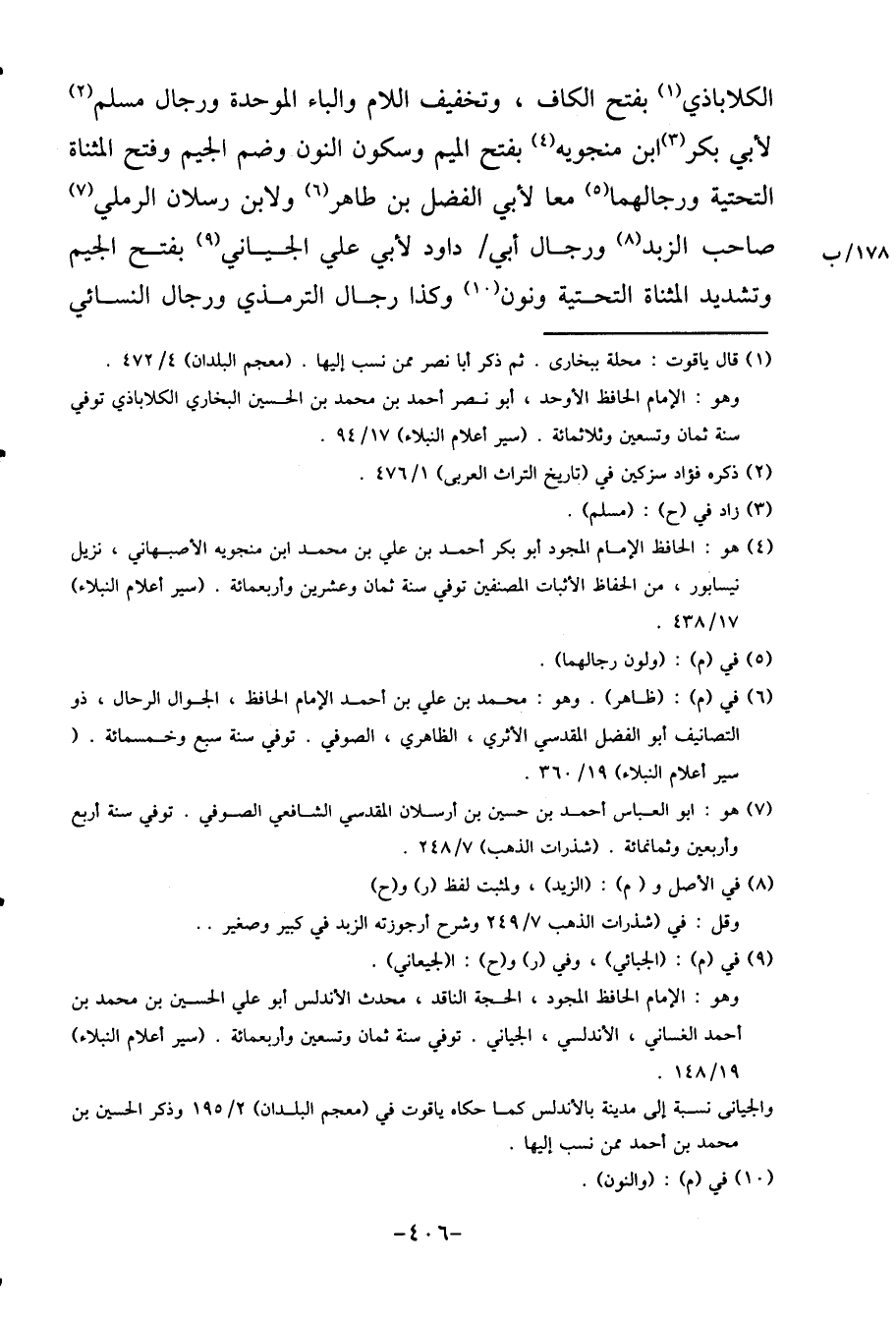الكلاباذي بِفَتْح الْكَاف، وَتَخْفِيف اللَّام وَالْبَاء الْمُوَحدَة وَرِجَال مُسلم لأبي بكر ابْن منجوية بِفَتْح الْمِيم وَسُكُون النُّون وَضم الْجِيم وَفتح الْمُثَنَّاة التَّحْتِيَّة ورجالهما مَعًا لأبي الْفضل بن طَاهِر وَلابْن رسْلَان الرَّمْلِيّ صَاحب الزّبد وَرِجَال أبي / دَاوُد لأبي عَليّ الجياني بِفَتْح الْجِيم وَتَشْديد الْمُثَنَّاة التَّحْتِيَّة وَنون وَكَذَا رجال التِّرْمِذِيّ وَرِجَال النَّسَائِيّ