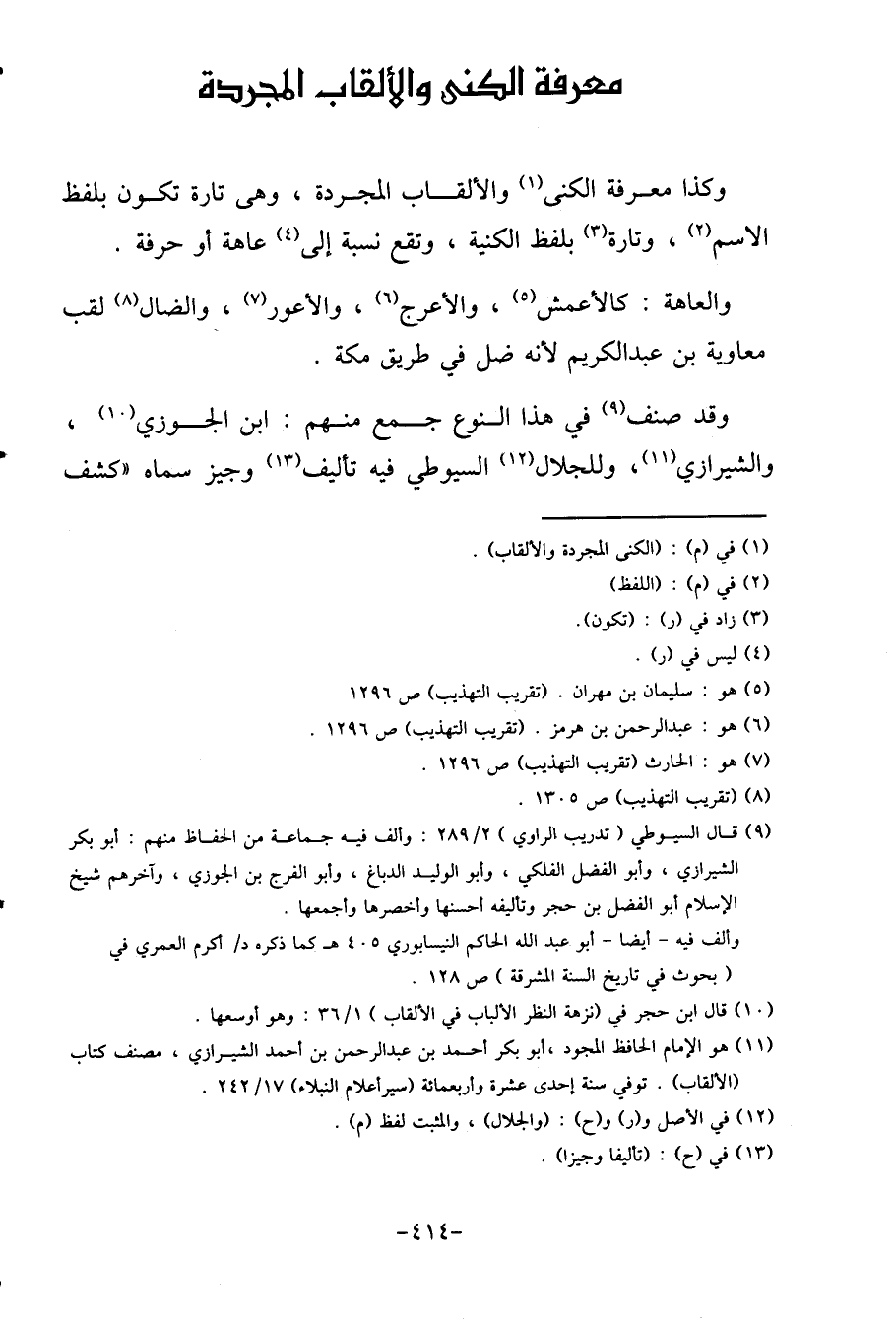 وَكَذَا معرفَة الكنى والألقاب الْمُجَرَّدَة، وَهِي تَارَة تكون بِلَفْظ الِاسْم، وَتارَة بِلَفْظ الكنية، وَتَقَع نِسْبَة إِلَى عاهة أَو حِرْفَة.