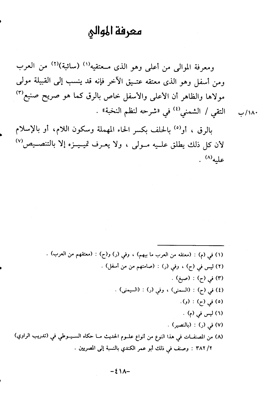 وَمَعْرِفَة الموَالِي من أَعلَى وَهُوَ الَّذِي معتقيه (سائبة) من الْعَرَب وَمن أَسْفَل وَهُوَ الَّذِي مُعْتقه عَتيق الآخر فَإِنَّهُ قد ينْسب إِلَى الْقَبِيلَة مولى مَوْلَاهَا وَالظَّاهِر أَن الْأَعْلَى والأسفل خَاص بِالرّقِّ كَمَا هُوَ صَرِيح صَنِيع التقي / الشمني فِي " شَرحه لنظم النخبة "