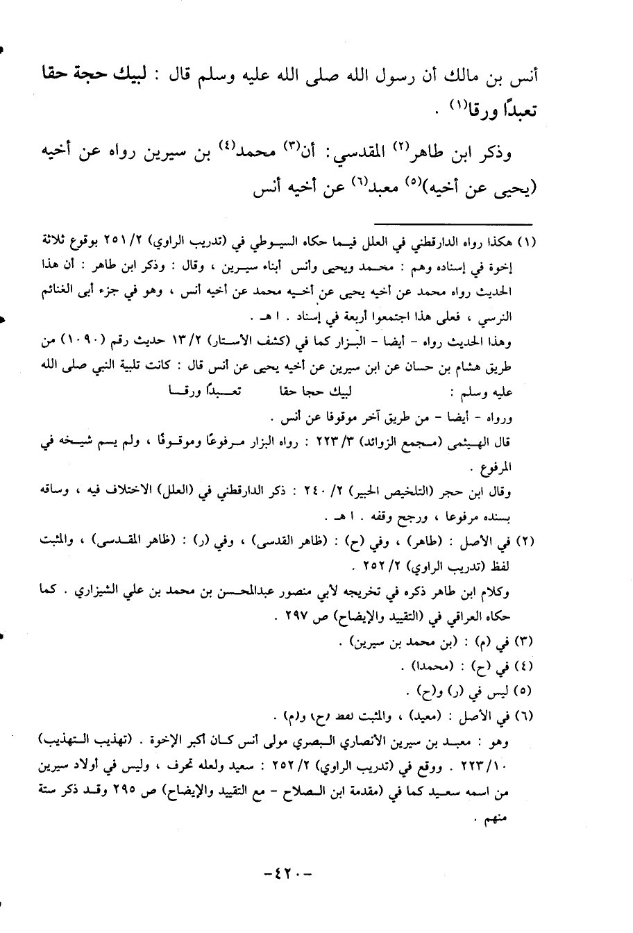 أنس بن مَالك أَن رَسُول الله قَالَ: لبيْك حجَّة حَقًا تعبدا وَرقا.