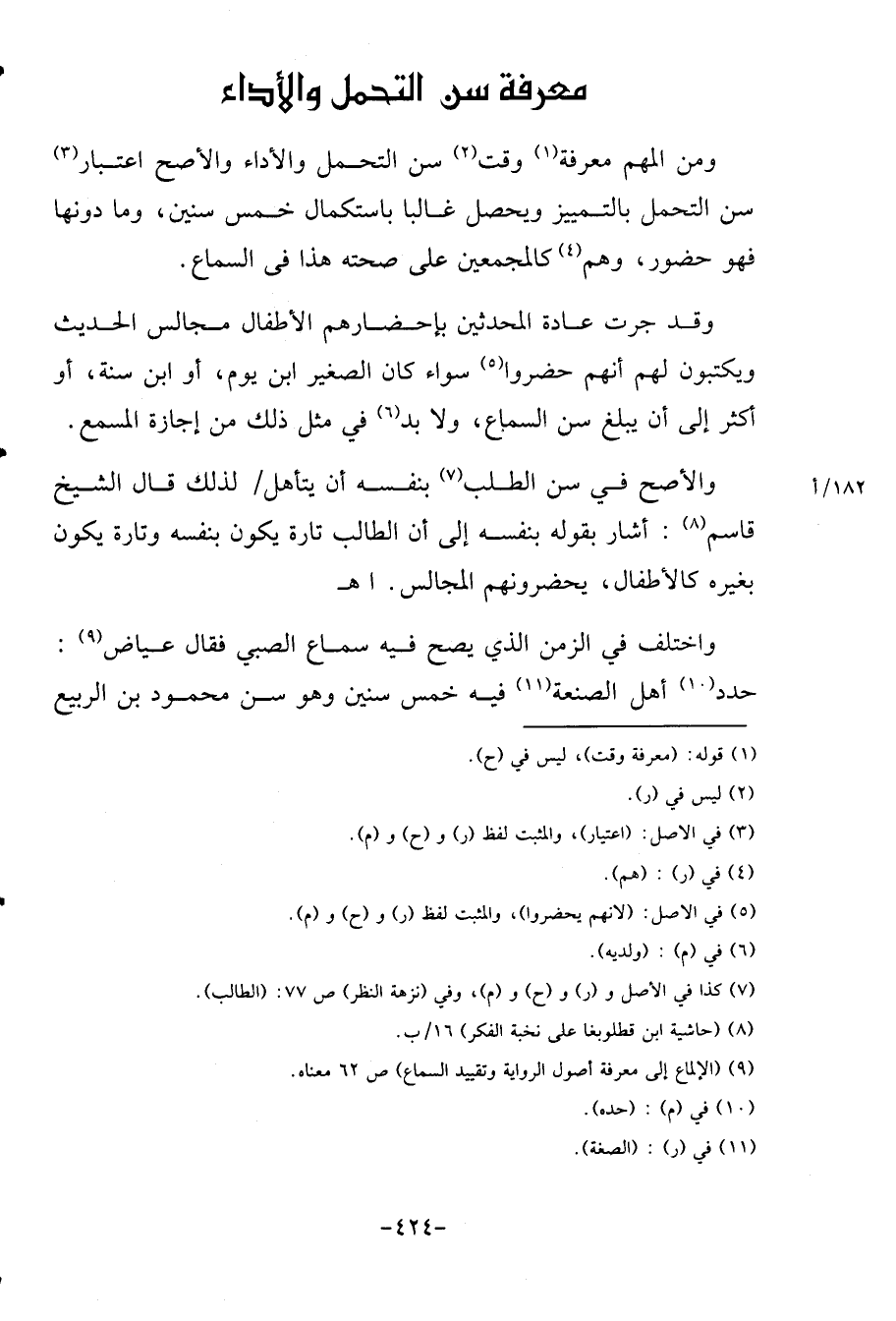 وَمن المهم معرفَة وَقت سنّ التَّحَمُّل وَالْأَدَاء وَالأَصَح اعْتِبَارا سنّ التَّحَمُّل بالتمييز وَيحصل غَالِبا باستكمال خمس سِنِين، وَمَا دونهَا فَهُوَ حُضُور، وهم كالمجمعين على صِحَّته هَذَا فِي السماع.