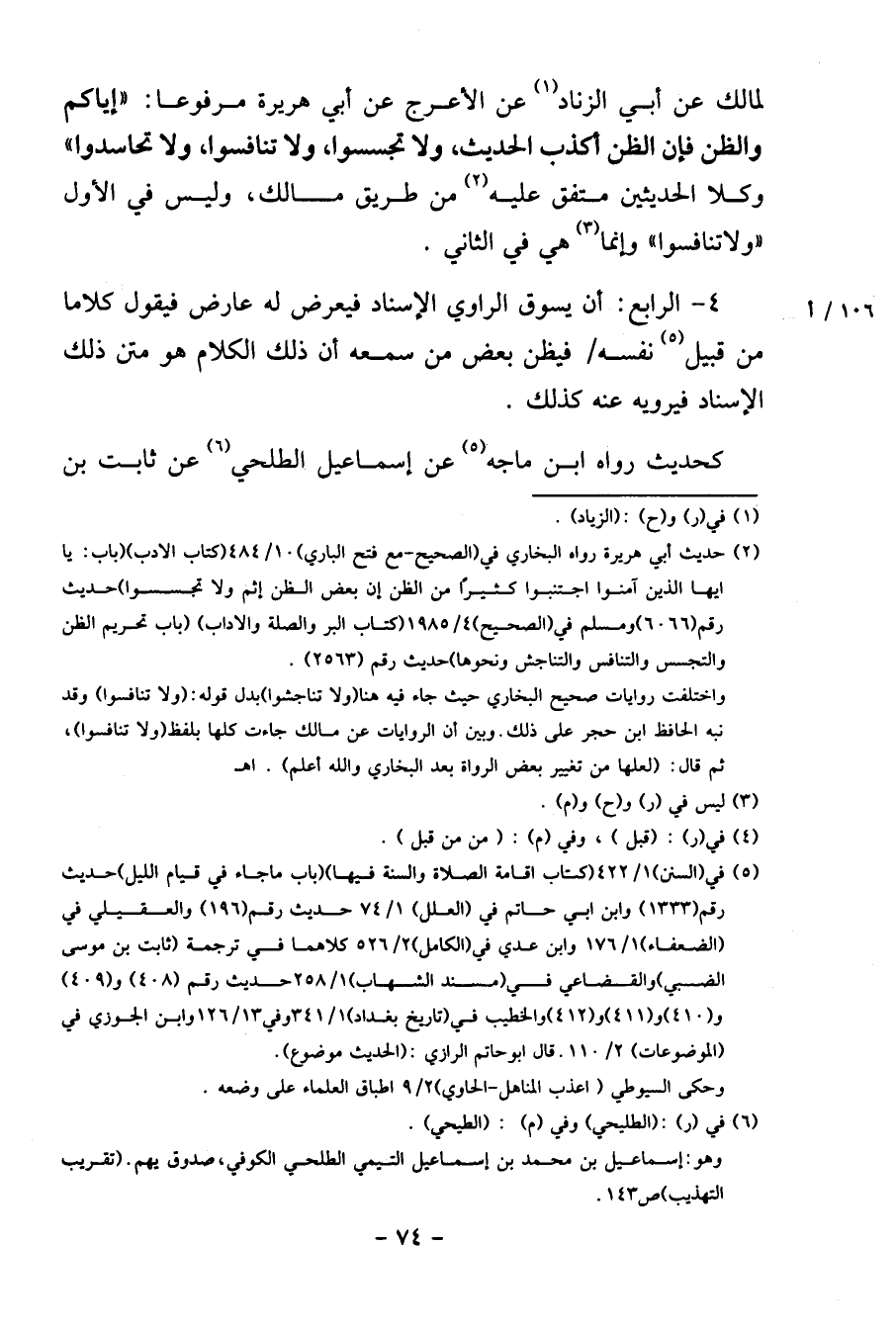 لمَالِك عَن أبي الزِّنَاد عَن الْأَعْرَج عَن أبي هُرَيْرَة مَرْفُوعا: " إيَّاكُمْ وَالظَّن فَإِن الظَّن أكذب الحَدِيث، وَلَا تجسسوا، وَلَا تنافسوا وَلَا تَحَاسَدُوا " وكلا الْحَدِيثين مُتَّفق عَلَيْهِ من طَرِيق مَالك، وَلَيْسَ فِي الأول " وَلَا تنافسوا " وَإِنَّمَا هِيَ فِي الثَّانِي.