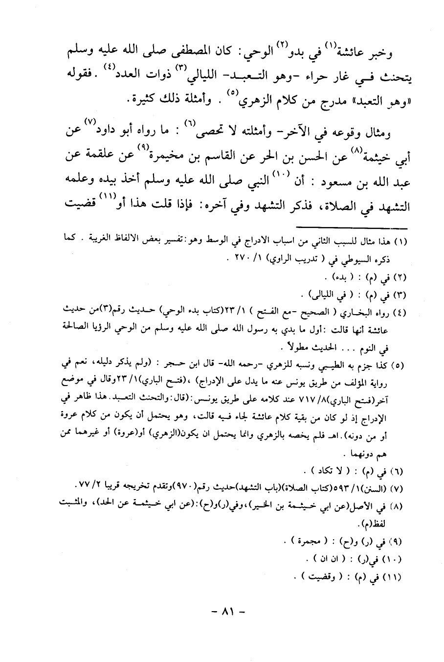 وَخبر عَائِشَة فِي بَدو الْوَحْي: كَانَ الْمُصْطَفى يَتَحَنَّث فِي غَار حراء - وَهُوَ التَّعَبُّد - اللَّيَالِي ذَوَات الْعدَد. فَقَوله " وَهُوَ التَّعَبُّد ". مدرج من كَلَام الزُّهْرِيّ. وأمثلة ذَلِك كَثِيرَة.
