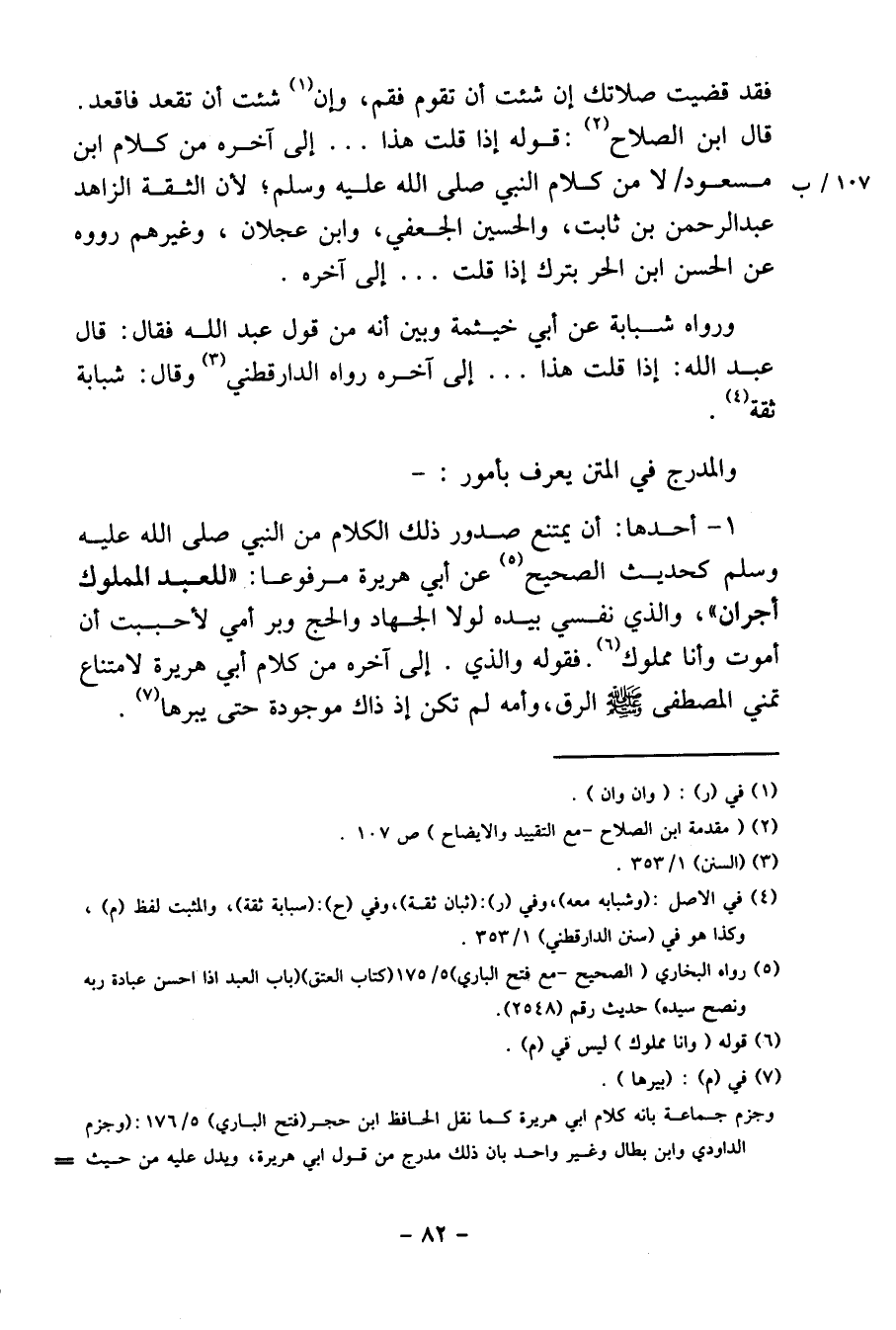 فقد قضيت صَلَاتك إِن شِئْت أَن تقوم فَقُمْ، وَإِن شِئْت أَن تقعد فَاقْعُدْ. قَالَ ابْن الصّلاح: قَوْله إِذا قلت هَذَا. . إِلَى آخِره من كَلَام ابْن مَسْعُود / لَا من كَلَام النَّبِي لِأَن الثِّقَة الزَّاهِد عبد الرَّحْمَن بن ثَابت، وَالْحُسَيْن الْجعْفِيّ، وَابْن عجلَان، وَغَيرهم رَوَوْهُ عَن الْحسن ابْن الْحر بترك إِذا قلت. . إِلَى آخِره.
