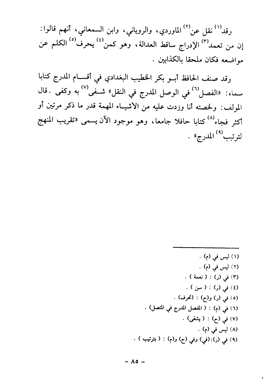 وَقد صنف الْحَافِظ أَبُو بكر الْخَطِيب الْبَغْدَادِيّ فِي أَقسَام المدرج كتابا سَمَّاهُ: " الْفَصْل فِي الْوَصْل المدرج فِي النَّقْل " شفى بِهِ وَكفى. قَالَ الْمُؤلف: ولخصته أَنا وزدت عَلَيْهِ من الْأَشْيَاء المهمة قدر مَا ذكر مرَّتَيْنِ أَو أَكثر فجَاء كتابا حافلا جَامعا، وَهُوَ مَوْجُود الْآن يُسمى " تقريب الْمنْهَج لترتيب المدرج ".