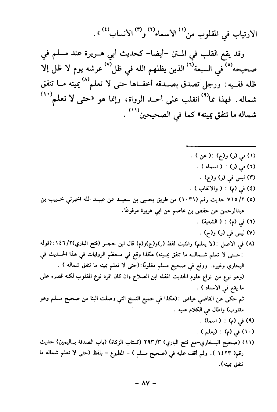 وَقد يَقع الْقلب فِي الْمَتْن - أَيْضا - كَحَدِيث أبي هُرَيْرَة عِنْد مُسلم فِي صَحِيحَة فِي السَّبْعَة الَّذين يظلهم الله فِي ظلّ عَرْشه يَوْم لَا ظلّ إِلَّا ظله فَفِيهِ: وَرجل تصدق بصدقه أخفاها حَتَّى لَا تعلم يَمِينه مَا تنْفق شِمَاله. فَهَذَا مِمَّا انْقَلب على أحد الروَاة، وَإِنَّمَا هُوَ " حَتَّى لَا تعلم شِمَاله مَا تنْفق يَمِينه " كَمَا فِي الصَّحِيحَيْنِ.