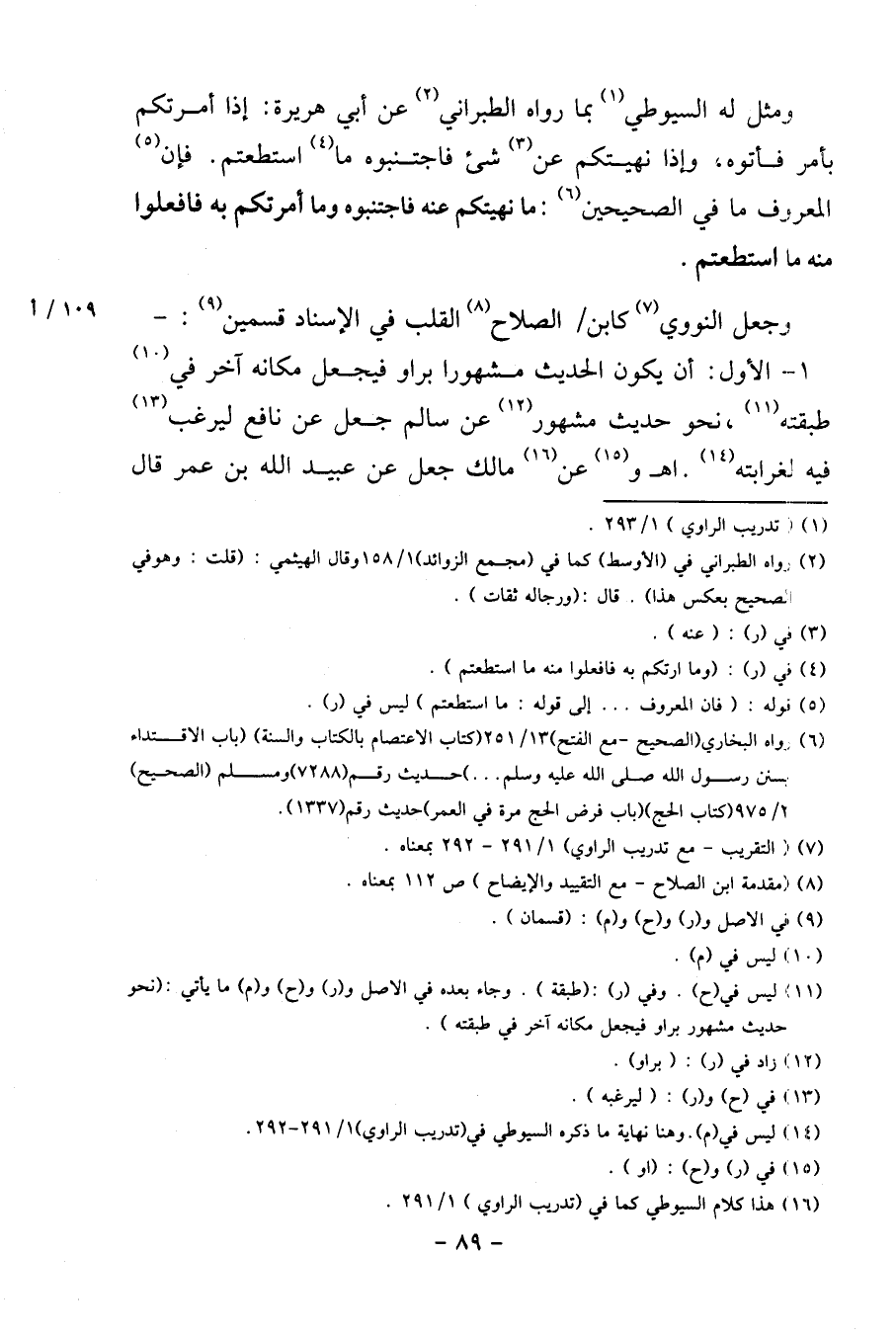وَمثل لَهُ السُّيُوطِيّ بِمَا رَوَاهُ الطَّبَرَانِيّ عَن أبي هُرَيْرَة: إِذا أَمرتكُم بِأَمْر فَأتوهُ، وَإِذا نَهَيْتُكُمْ عَن شئ فَاجْتَنبُوهُ مَا اسْتَطَعْتُم. فَإِن الْمَعْرُوف مَا فِي الصَّحِيحَيْنِ: مَا نَهَيْتُكُمْ عَنهُ فَاجْتَنبُوهُ وَمَا أَمرتكُم بِهِ فافعلوا مِنْهُ مَا اسْتَطَعْتُم.