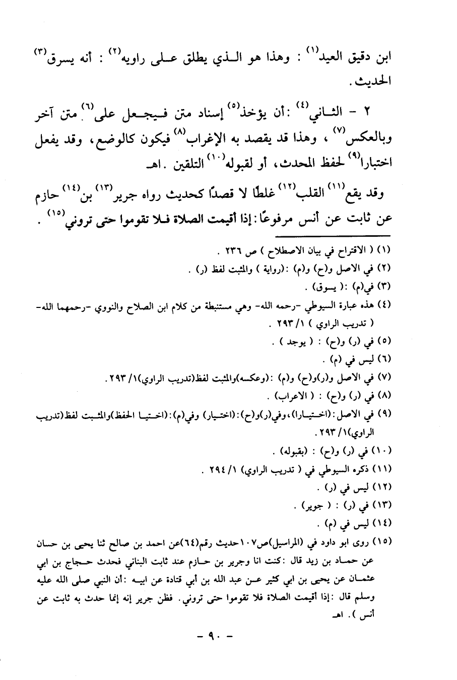 ابْن دَقِيق الْعِيد: وَهَذَا هُوَ الَّذِي يُطلق على رَاوِيه: أَنه يسرق الحَدِيث. 2 - الثَّانِي: أَن يُؤْخَذ إِسْنَاد متن فَيجْعَل على متن آخر وَبِالْعَكْسِ، وَهَذَا قد يقْصد بِهِ الإغراب فَيكون كالوضع، وَقد يفعل اختبارا لحفظ الْمُحدث، أَو لقبوله التَّلْقِين. اه. وَقد يَقع الْقلب غَلطا لَا قصدا كَحَدِيث رَوَاهُ جرير بن حَازِم عَن ثَابت عَن أنس مَرْفُوعا: إِذا أُقِيمَت الصَّلَاة فَلَا تقوموا حَتَّى تروني.