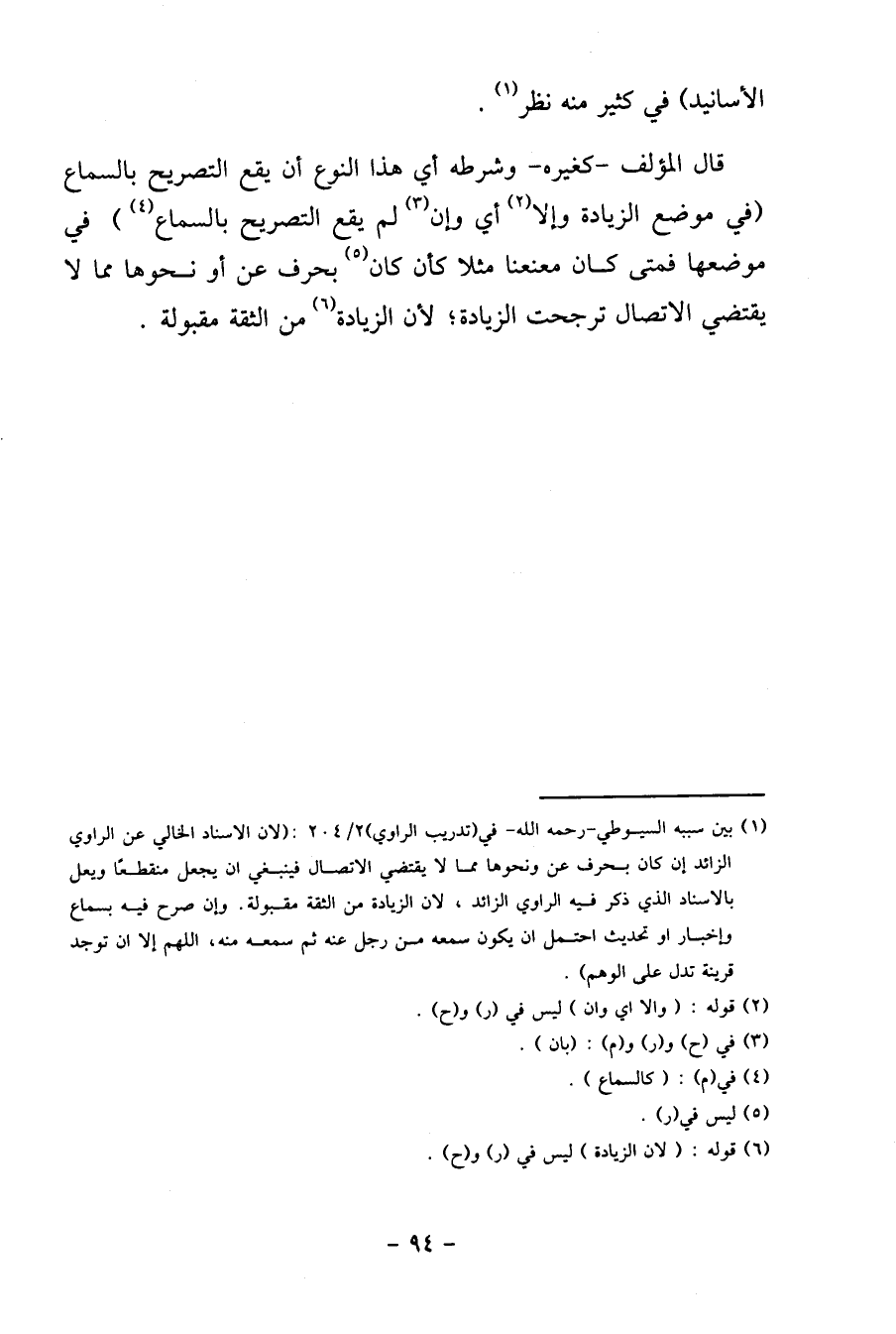 قَالَ الْمُؤلف - كَغَيْرِهِ - وَشَرطه أَي هَذَا النَّوْع أَن يَقع التَّصْرِيح بِالسَّمَاعِ (فِي مَوضِع الزِّيَادَة وَإِلَّا أَي وَإِن لم يَقع التَّصْرِيح بِالسَّمَاعِ) فِي موضعهَا فَمَتَى كَانَ مُعَنْعنًا مثلا كَأَن كَانَ بِحرف عَن أَو نَحْوهَا مِمَّا لَا يَقْتَضِي الِاتِّصَال ترجحت الزِّيَادَة، لِأَن الزِّيَادَة من الثِّقَة مَقْبُولَة.