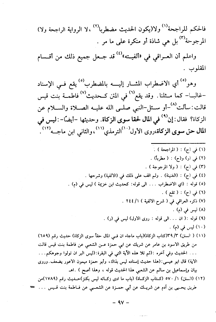 وَهُوَ أَي الِاضْطِرَاب الْمشَار إِلَيْهِ بالمضطرب يَقع فِي الْإِسْنَاد - غَالِبا - كَمَا مثلنَا. وَقد يَقع فِي الْمَتْن كَحَدِيث فَاطِمَة بنت قيس قَالَت: سَأَلت - أَو سُئِلَ - النَّبِي عَن الزَّكَاة؟ فَقَالَ: إِن فِي المَال لَحقا سوى الزَّكَاة. وحديثها - أَيْضا -: لَيْسَ فِي المَال حق سوى الزَّكَاة، روى الأول التِّرْمِذِيّ، وَالثَّانِي ابْن مَاجَه.