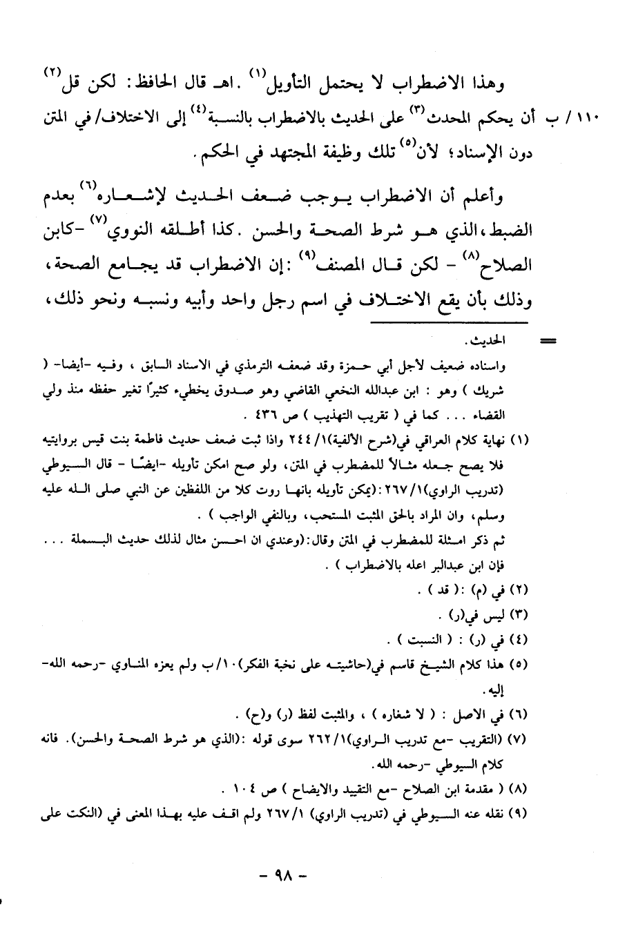 وَأعلم أَن الِاضْطِرَاب يُوجب ضعف الحَدِيث لإشعاره بِعَدَمِ الضَّبْط، الَّذِي هُوَ شَرط الصِّحَّة وَالْحسن. كَذَا أطلقهُ النَّوَوِيّ - كَابْن الصّلاح - لَكِن قَالَ المُصَنّف: إِن الِاضْطِرَاب قد يُجَامع الصِّحَّة، وَذَلِكَ بِأَن يَقع الِاخْتِلَاف فِي اسْم رجل وَاحِد وَأَبِيهِ وَنسبه وَنَحْو ذَلِك،