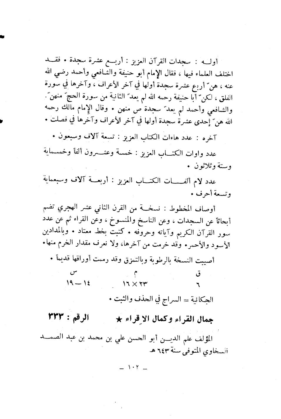 أوصاف المخطوط: نسخة من القرن الثاني عشر الهجري تضم أبحاثا عن السجدات، وعن الناسخ والمنسوخ، وعن القراء ثم عن عدد سور القرآن الكريم وآياته وحروفه. كتبت بخط معتاد. وبالمدادين الأسود والأحمر. وقد خرمت من آخرها، ولا نعرف مقدار الخرم منها.