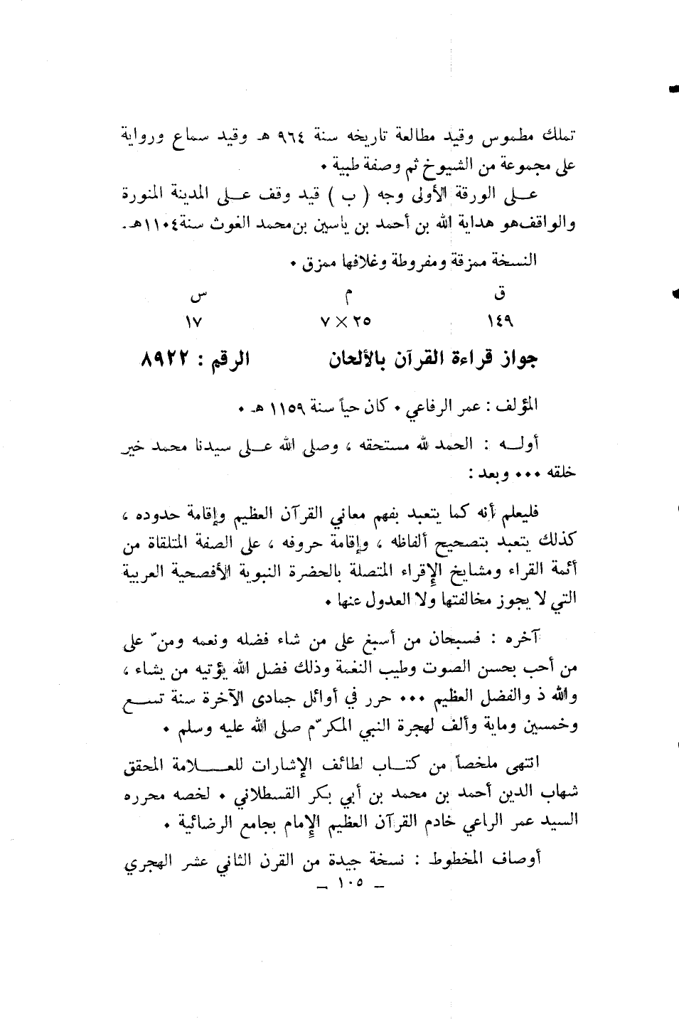 آخره: فسبحان من أسبغ على من شاء فضله ونعمه ومنّ على من أحب بحسن الصوت وطيب النغمة وذلك فضل الله يؤتيه من يشاء، والله ذو الفضل العظيم ... حرر في أوائل جمادى الآخرة سنة تسع وخمسين ومائة وألف لهجرة النبي المكرّم صلى الله عليه وسلم.