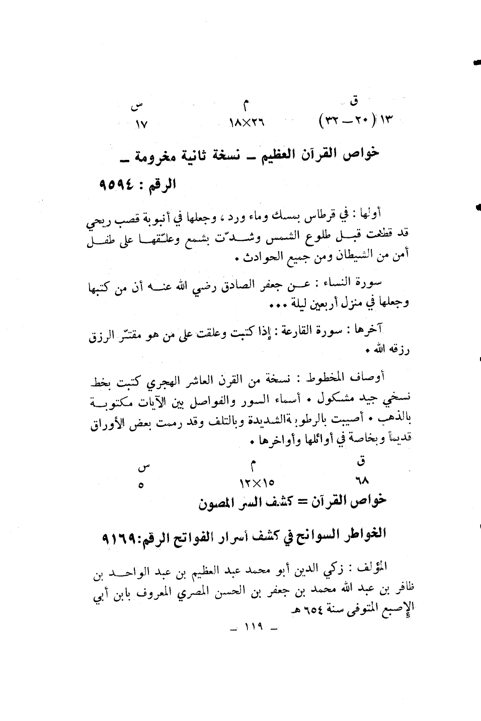 خواص القرآن العظيم- نسخة ثانية مخرومة- الرقم: 9594