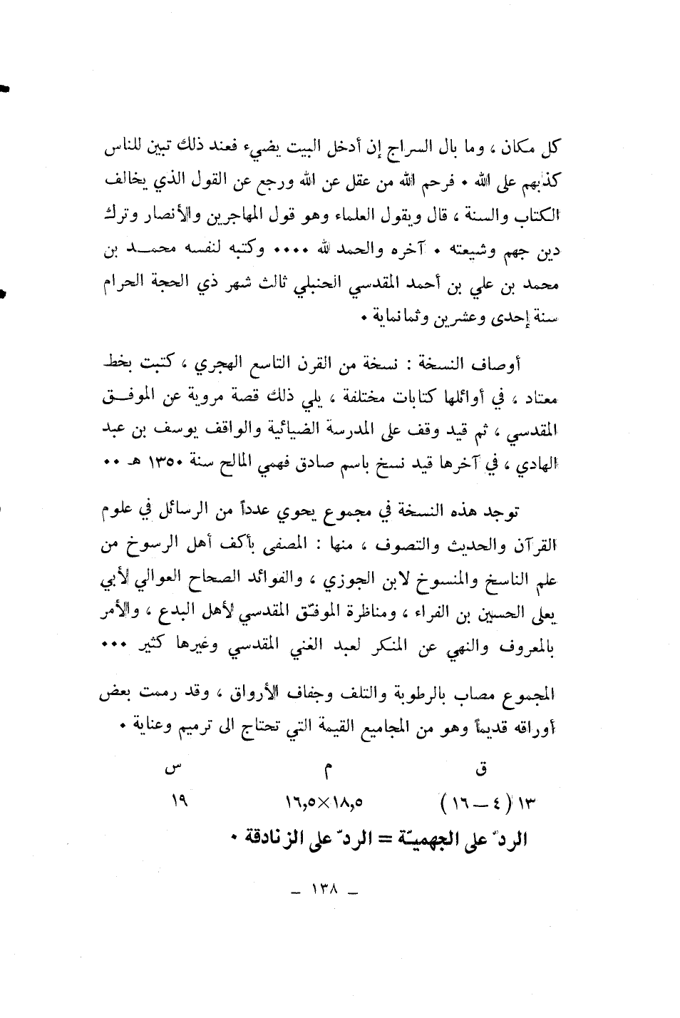 كل مكان، وما بال السراج إن أدخل البيت يضيء فعند ذلك تبين للناس كذبهم على الله. فرحم الله من عقل عن الله ورجع عن القول الذي يخالف الكتاب والسنة، قال ويقول العلماء وهو قول المهاجرين والأنصار وترك دين جهم وشيعته. آخره والحمد لله .... وكتبه لنفسه محمد بن محمد بن علي بن أحمد المقدسي الحنبلي ثالث شهر ذي الحجة الحرام سنة إحدى وعشرين وثمانمائة.