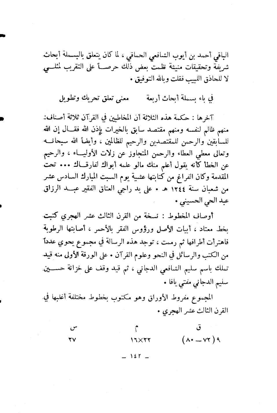 منهم ظالم لنفسه ومنهم مقتصد سابق بالخيرات بإذن الله فقال إن الله للسابقين والرحمن للمقتصدين والرحيم للظالمين، وأيضا الله سبحانه وتعالى معطي العطاء والرحمن المتجاوز عن زلات الأولياء، والرحيم عن الخطأ كأنه يقول أعلم منك ما لو علمه أبواك لفارقاك ... تحت المقدمة وكان الفراغ من كتابتها عشية يوم السبت المبارك السادس عشر من شعبان سنة 1244 هـ. على يد راجي العتاق الفقير عبد الرزاق عبد الحي الحسيني.