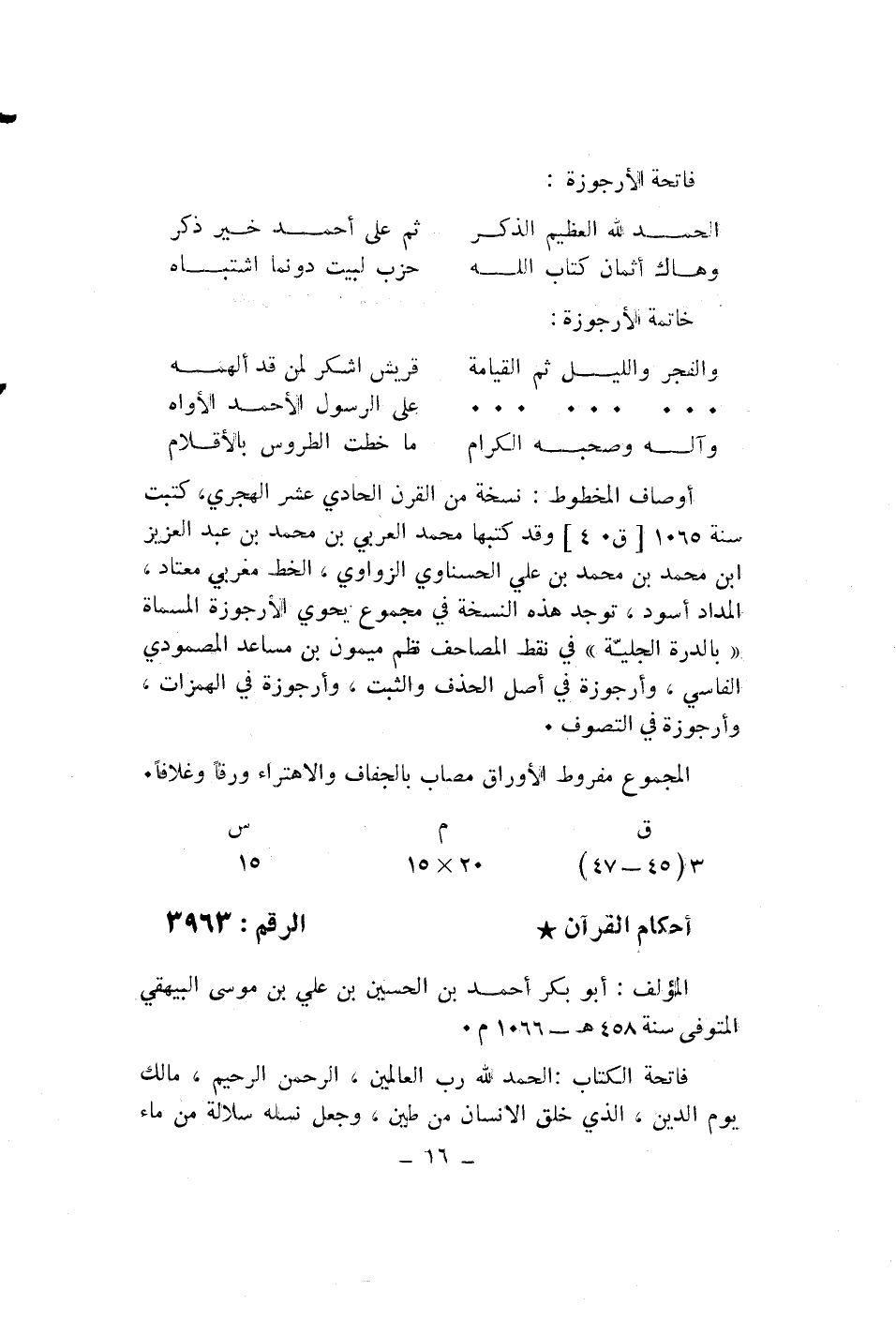 أوصاف المخطوط: نسخة من القرن الحادي عشر الهجري، كتبت سنة 1065 [ق 40] وقد كتبها محمد العربي بن محمد بن عبد العزيز ابن محمد بن محمد بن علي الحسناوي الزواوي، الخط مغربي معتاد، المداد أسود، توجد هذه النسخة في مجموع يحوي الأرجوزة المسماة «بالدرة الجليّة» في نقط المصاحف نظم ميمون بن مساعد المصمودي الفاسي، وأرجوزة في أصل الحذف والثبت، وأرجوزة في الهمزات، وأرجوزة في التصوف.