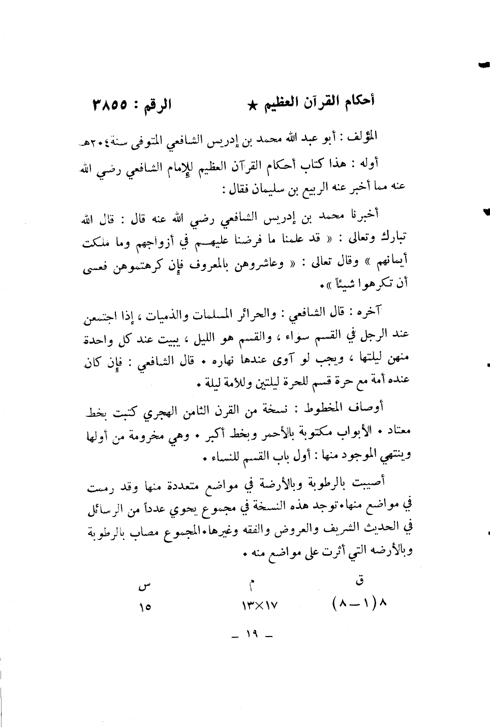 المؤلف: أبو عبد الله محمد بن إدريس الشافعي المتوفى سنة 204 هـ أوله: هذا كتاب أحكام القرآن العظيم للإمام الشافعي رضي الله عنه مما أخبر عنه الربيع بن سليمان فقال: