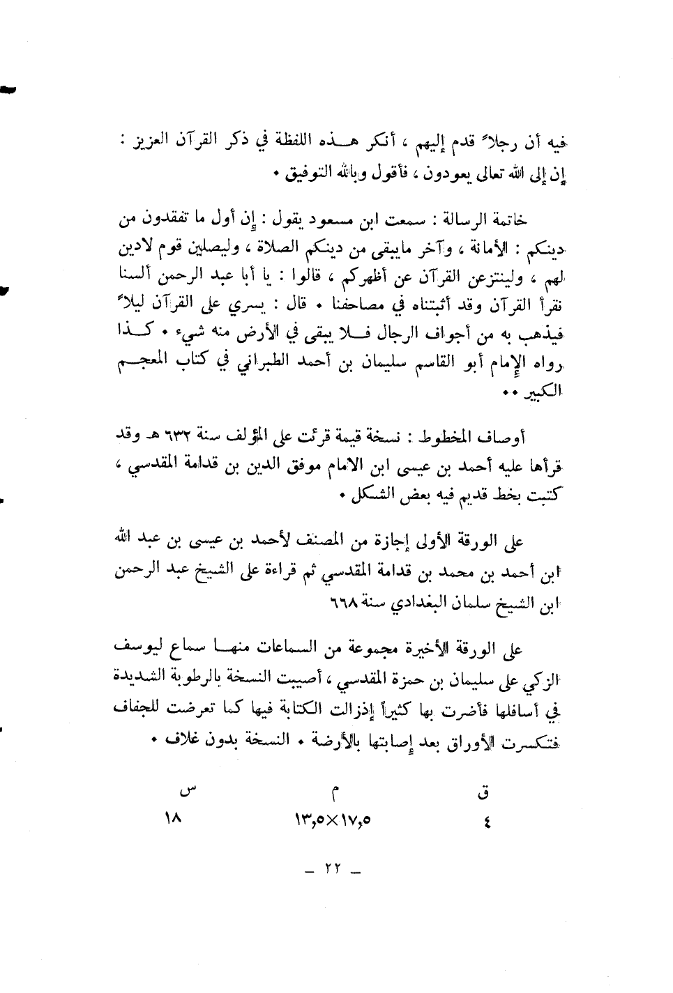 خاتمة الرسالة: سمعت ابن مسعود يقول: إن أول ما تفقدون من دينكم: الأمانة، وآخر ما يبقى من دينكم الصلاة، وليصلين قوم لا دين لهم، ولينتزعن القرآن عن أظهركم، قالوا: يا أبا عبد الرحمن ألسنا نقرأ القرآن وقد أثبتناه في مصاحفنا. قال: يسري على القرآن ليلا فيذهب به من أجواف الرجال فلا يبقى في الأرض منه شيء. كذا رواه الإمام أبو القاسم سليمان بن أحمد الطبراني في كتاب المعجم الكبير ..
