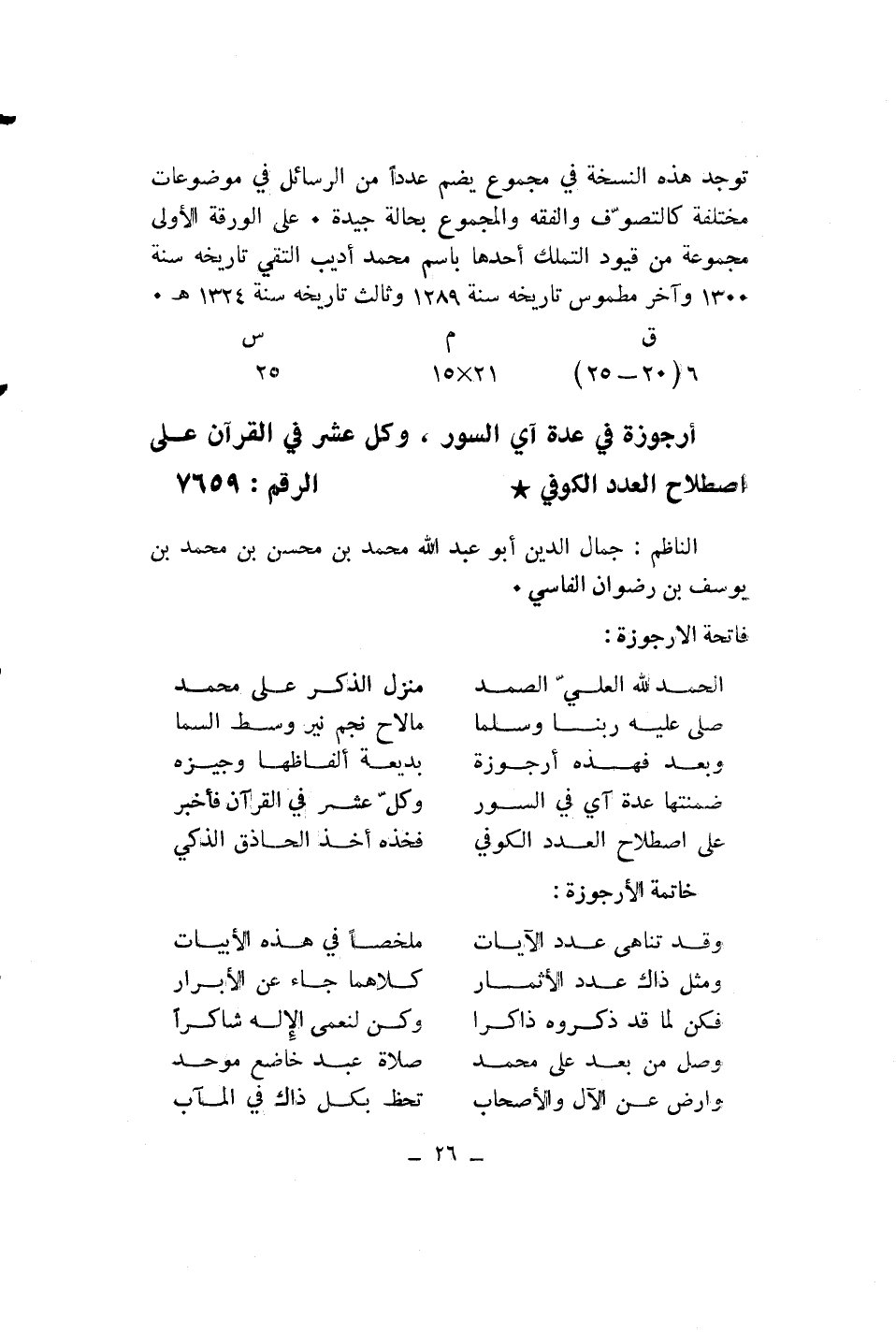 أرجوزة في عدة أي السور، وكل عشر في القرآن على اصطلاح العدد الكوفي* الرقم: 7659