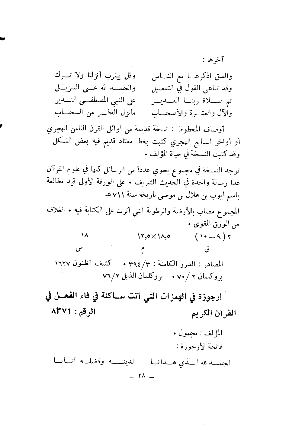 أرجوزة في الهمزات التي أتت ساكنة في فاء الفعل في القرآن الكريم* الرقم: 8371