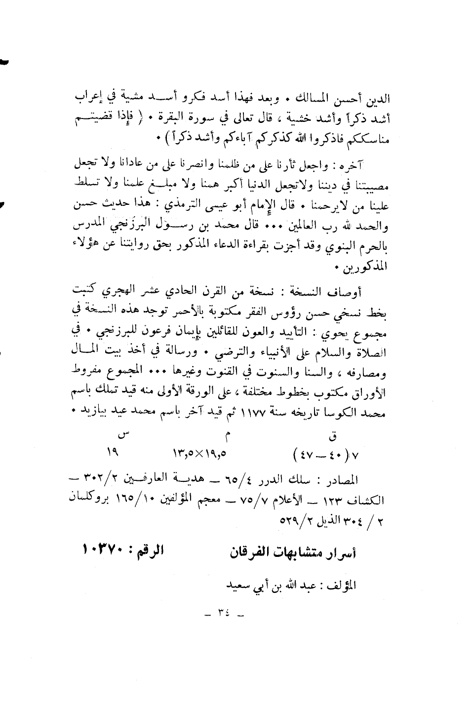 (ق 7 (40 - 47) / م 5، 19* 5، 13/ س 19) المصادر: سلك الدرر 4/ 65 - هدية العارفين 2/ 302 - الكشاف 123 - الأعلام 7/ 75 - معجم المؤلفين 10/ 165 بروكلمان 2/ 304 الذيل 2/ 529