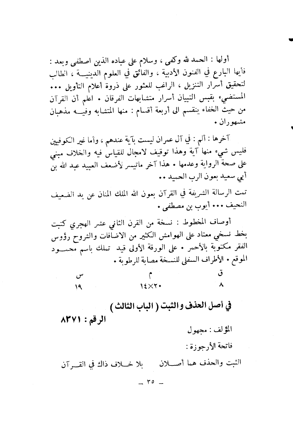 في أصل الحذف والثبت (الباب الثالث) * الرقم: 8371
