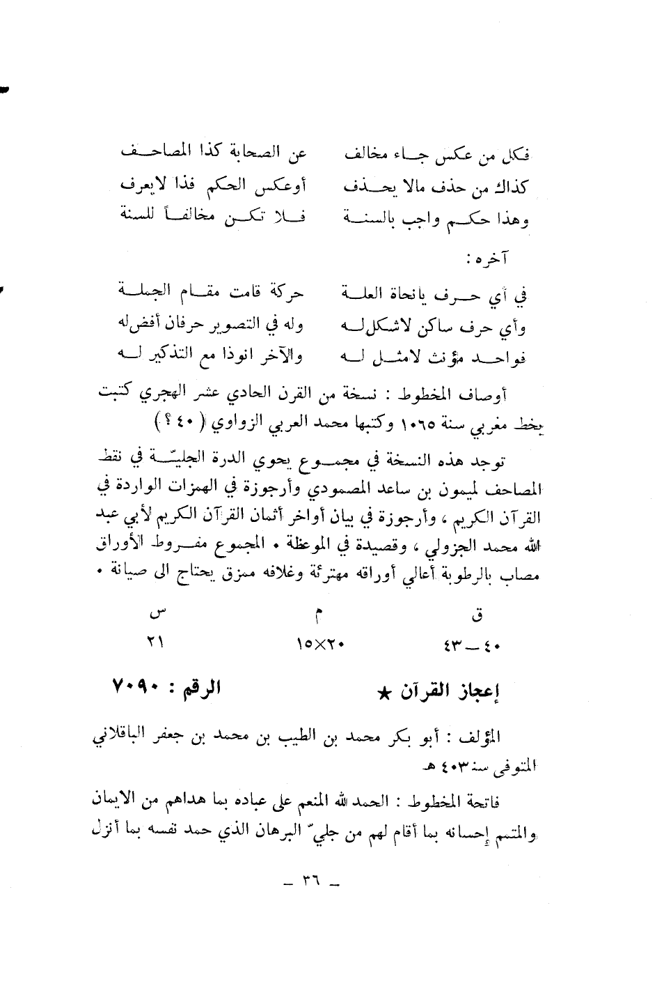 المؤلف: أبو بكر محمد بن الطيب بن محمد بن جعفر الباقلاني المتوفى سنة 403 هـ فاتحة المخطوط: الحمد لله المنعم على عباده بما هداهم من الايمان والمتمم إحسانه بما أقام لهم من جليّ البرهان الذي حمد نفسه بما أنزل