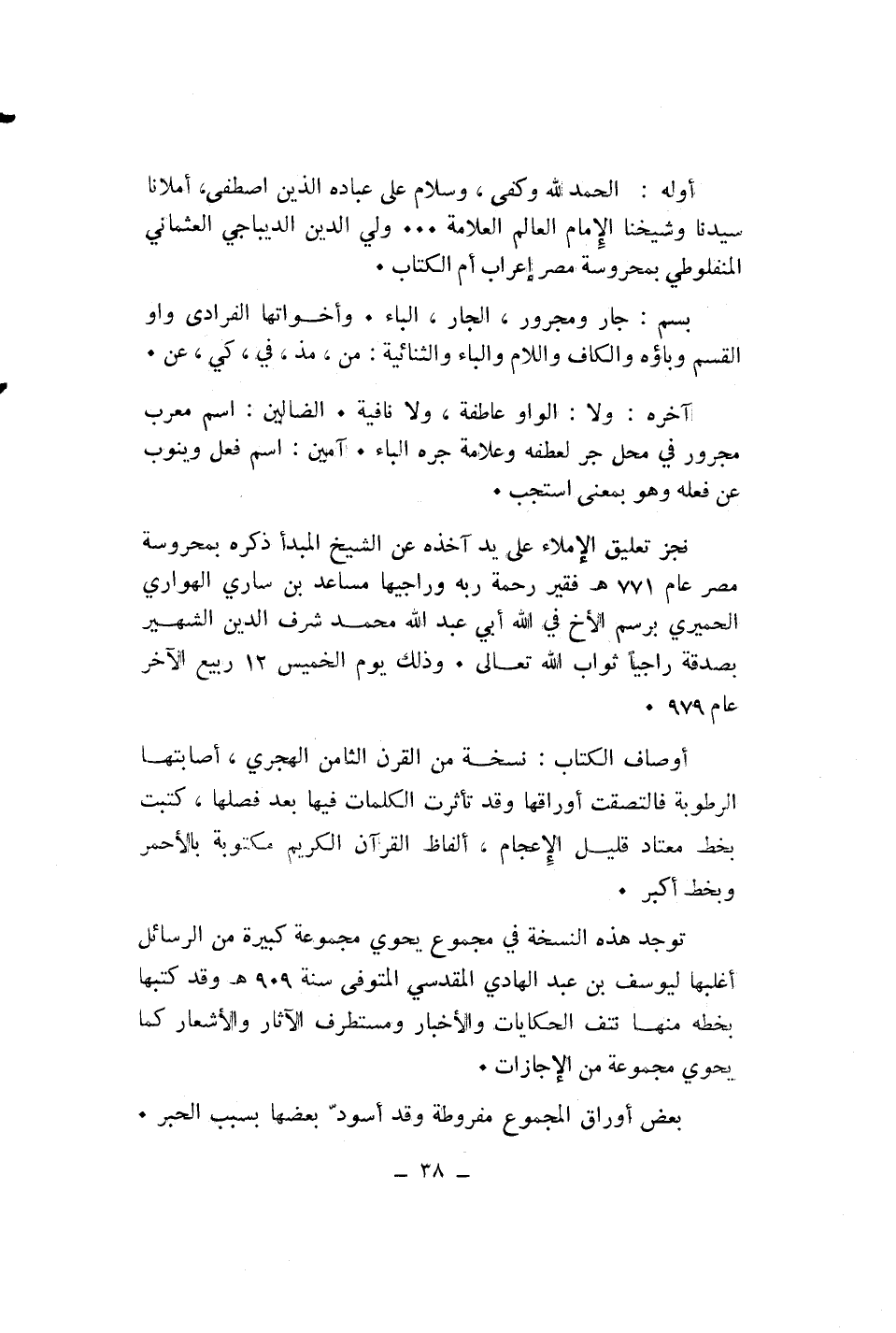 أوله: الحمد لله وكفى، وسلام على عباده الذين اصطفى، أملانا سيدنا وشيخنا الإمام العالم العلامة ... ولي الدين الديباجي العثماني المنفلوطي بمحروسة مصر إعراب أم الكتاب.
