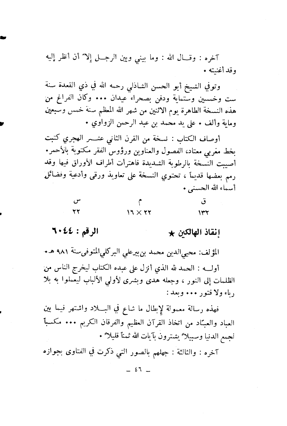 وتوفي الشيخ أبو الحسن الشاذلي رحمه الله في ذي القعدة سنة ست وخمسين وستمائة ودفن بصحراء عيدان ... وكان الفراغ من هذه النسخة الطاهرة يوم الاثنين من شهر الله المعظم سنة خمس وسبعين ومائة وألف. على يد محمد بن عبد الرحمن الزواوي.