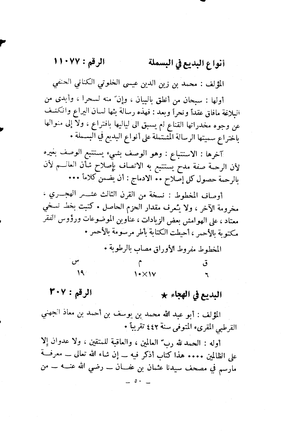 المؤلف: محمد بن زين الدين عيسى الخلوتي الكناني الحنفي أولها: سبحان من أنطق بالبيان، وإنّ منه لسحرا، وأبدى من البلاغة ما فاق عقدا ونحرا وبعد: فهذه رسالة بثها لسان اليراع وانكشف عن وجوه مخدراتها القناع لم يسبق الى لياليها بافتراع، ولا إلى منوالها باختراع سميتها الرسالة المشتملة على أنواع البديع في البسملة.