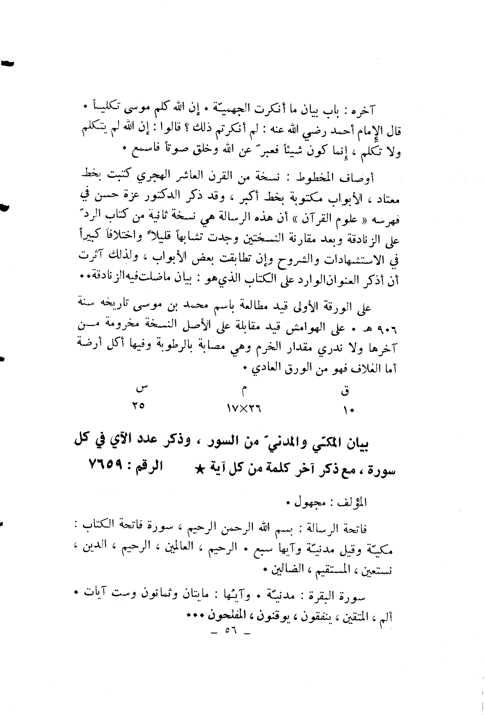 بيان المكّي والمدنيّ من السور، وذكر عدد الآي في كل سورة، مع ذكر آخر كلمة من كل آية* الرقم: 7659