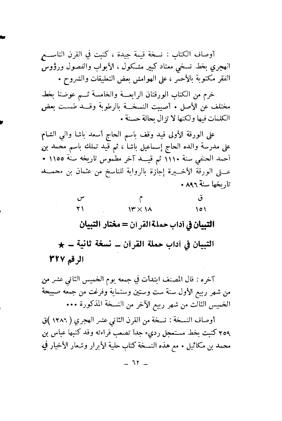 الرقم 327 آخره: قال المصنف ابتدأت في جمعه يوم الخميس الثاني عشر من من شهر ربيع الأول سنة ست وستين وستمائة وفرغت من جمعه صبيحة الخميس الثالث من شهر ربيع الآخر من النسخة المذكورة ...