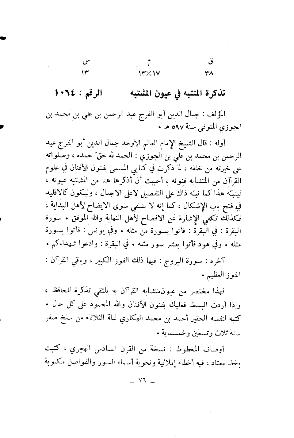 أوله: قال الشيخ الإمام العالم الأوحد جمال الدين أبو الفرج عبد الرحمن بن محمد بن علي بن الجوزي: الحمد لله حقّ حمده، وصلواته على خيرته من خلقه، لما ذكرت في كتابي المسمى بفنون الأفنان في علوم القرآن من المتشابه فنونه، أحببت أن أذكرها هنا من المشتبه عيونه، لينبّه هذا كما نبّه ذاك على التفصيل لا على الاجمال، وليكون كالاقليد في فتح باب الإشكال، كما إنه لا يشفي سوى الايضاح لأهل البداية، فكذلك تكفي الإشارة عن الافصاح لأهل النهاية والله الموفق. سورة البقرة: في البقرة: فأتوا بسورة من مثله. وفي يونس: فأتوا بسورة مثله. وفي هود فأتوا بعشر سور مثله. في البقرة: وادعوا شهداءكم.