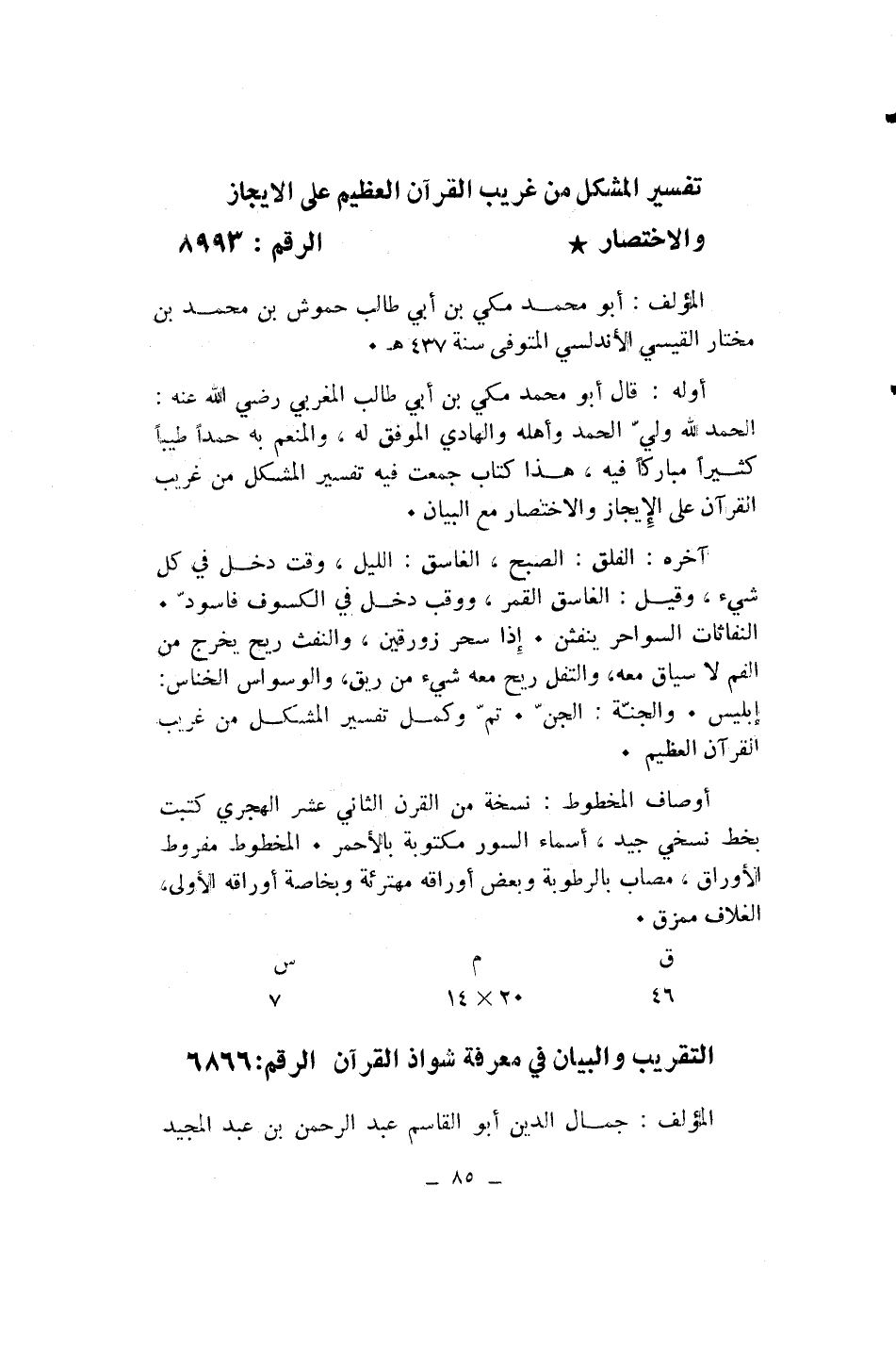 المؤلف: أبو محمد مكي بن أبي طالب حموش بن محمد بن مختار القيسي الأندلسي المتوفى سنة 437 هـ.